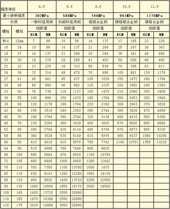 1、以上是德國工業標準,表中扭矩值為螺栓達到屈服極限的70%時所測定。